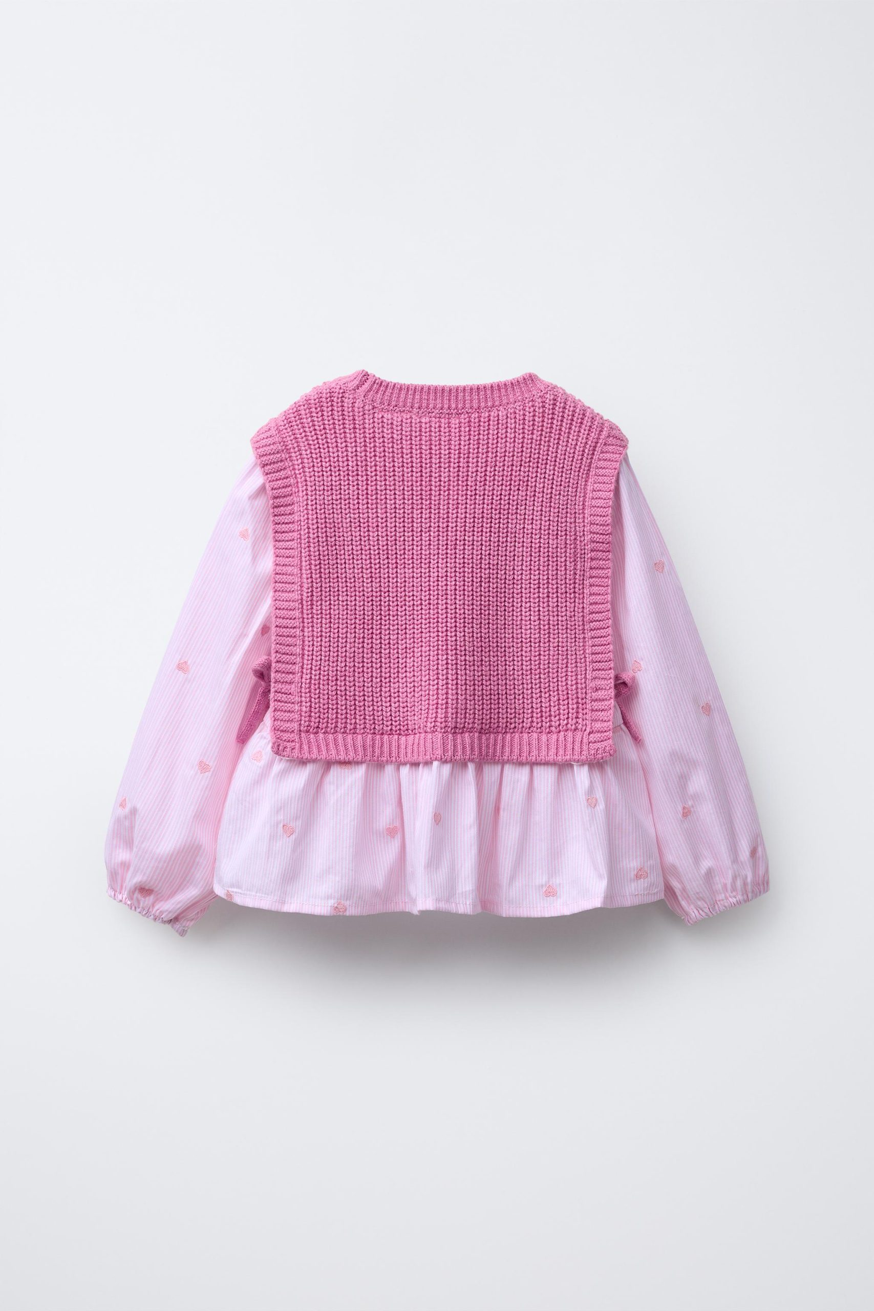 Lastikli uzun kollu, bisiklet yaka gömlek. Çizgili baskılı ve kalp işlemeli detaylı. Üzerinde bisiklet yaka ve kolsuz örgü yelek. Yanlarda bağcık aplikeli.