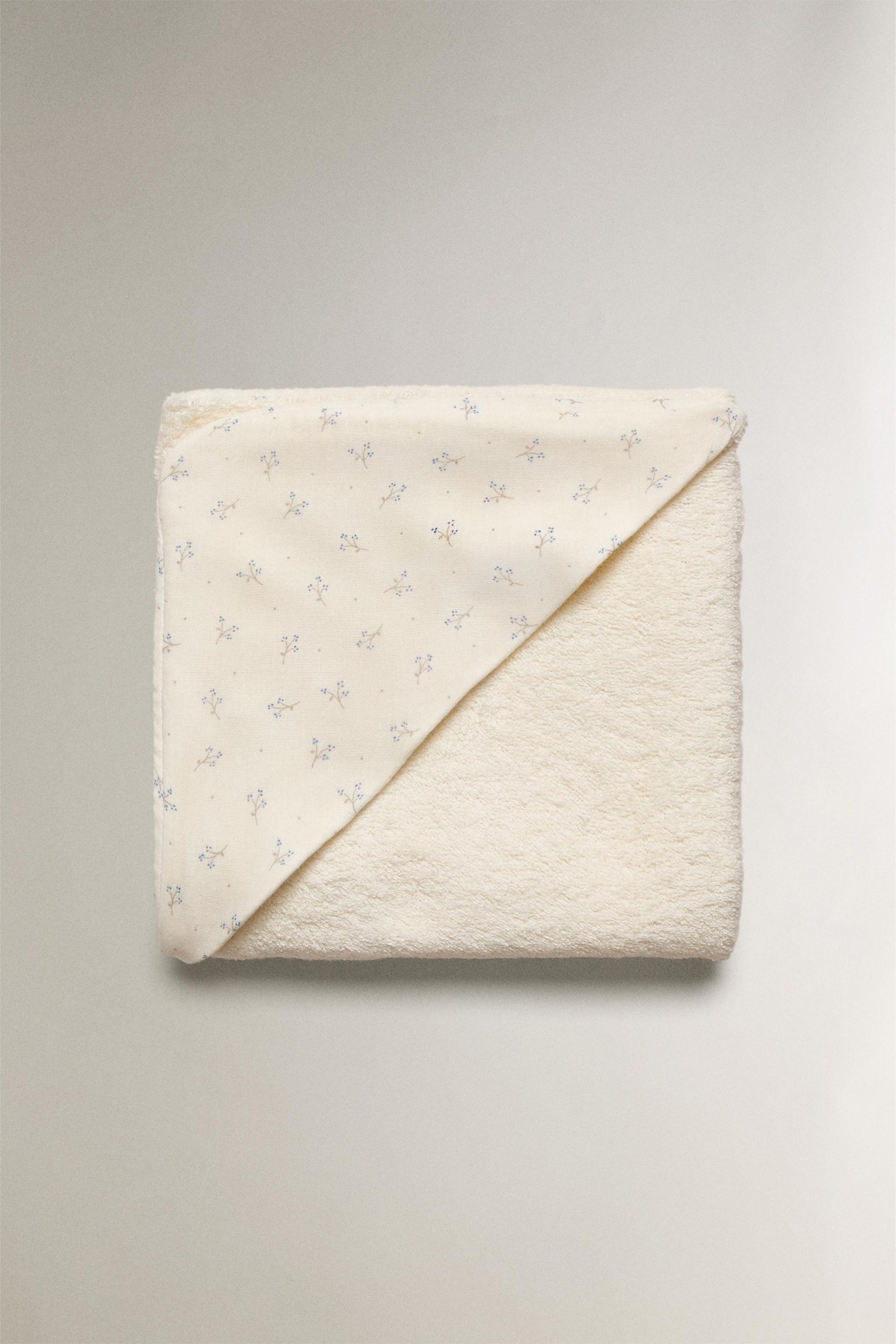 Pamuklu havlu kumaştan, mini çiçek desenli, kapüşonlu bebek havlusu.
