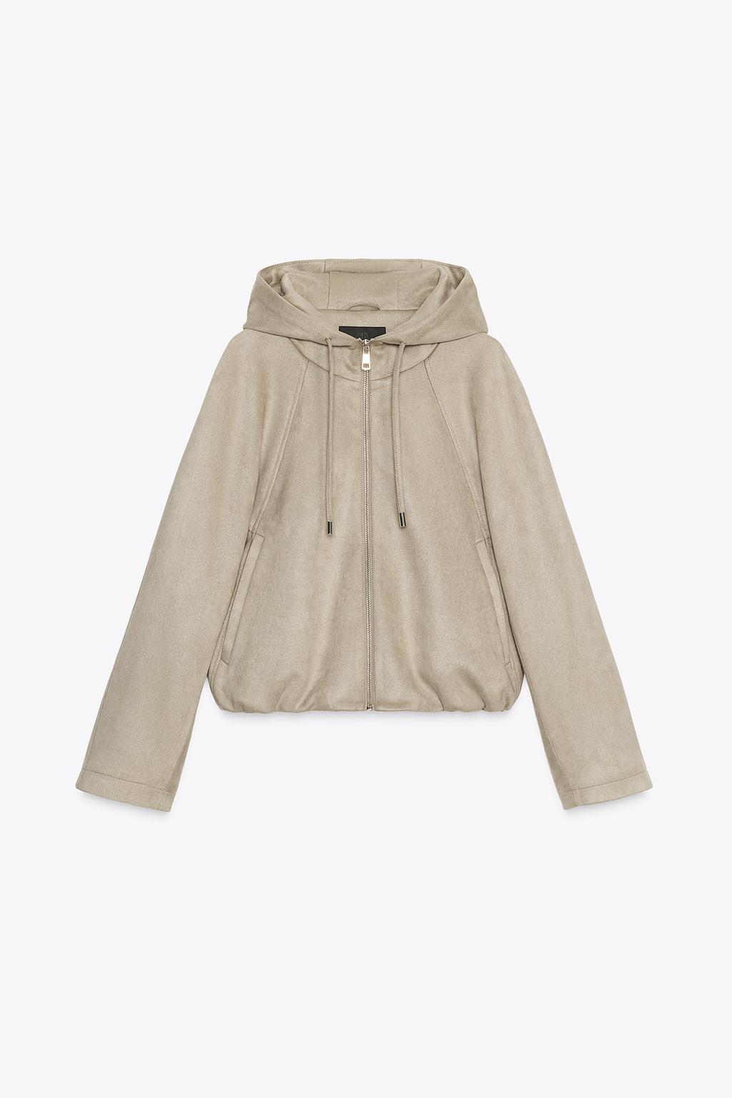 Ayarlanabilir bağcıklı kapüşonlu, yan cepli, iç astarlı, etek ucu içten lastikli ve önü fermuarlı bomber ceket.