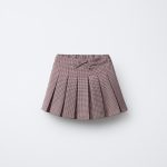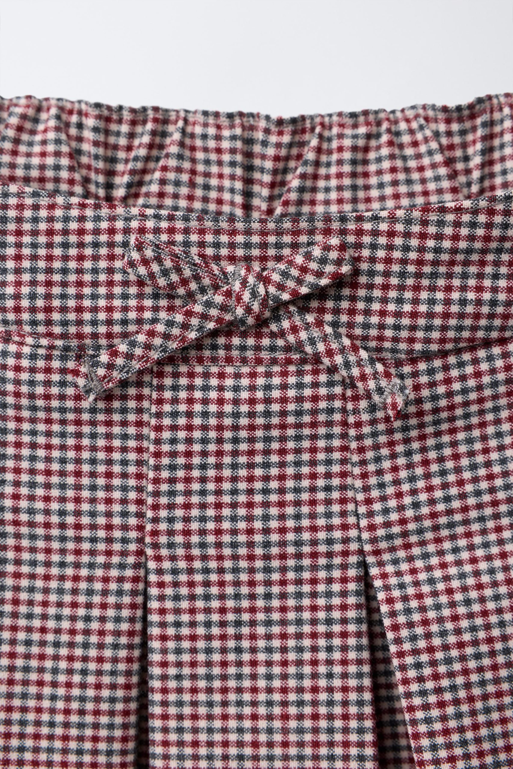 - Elastik belli, bermuda model etek. Önünde fiyonk aplikeli ve pile detaylı. Kareli baskılı.