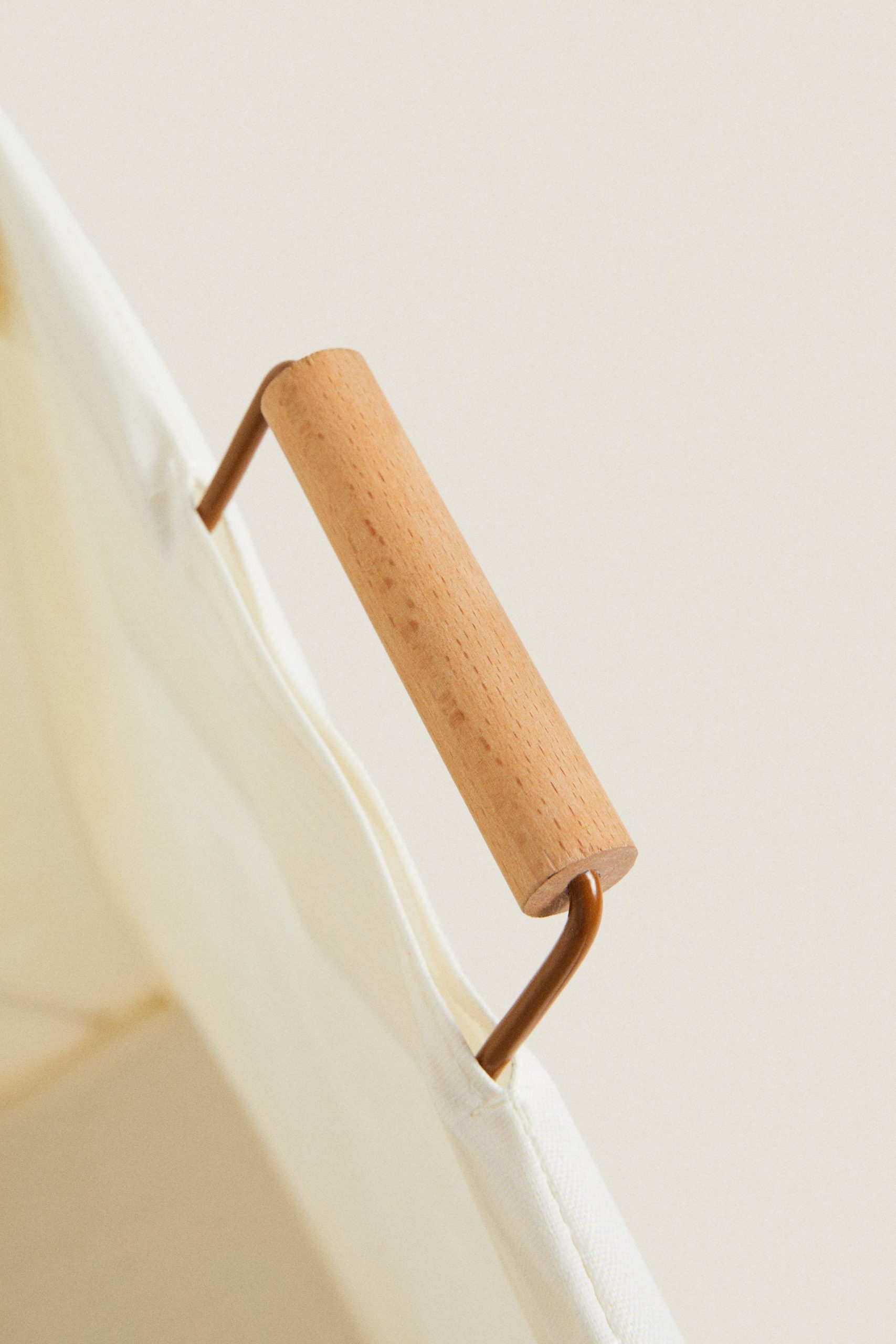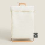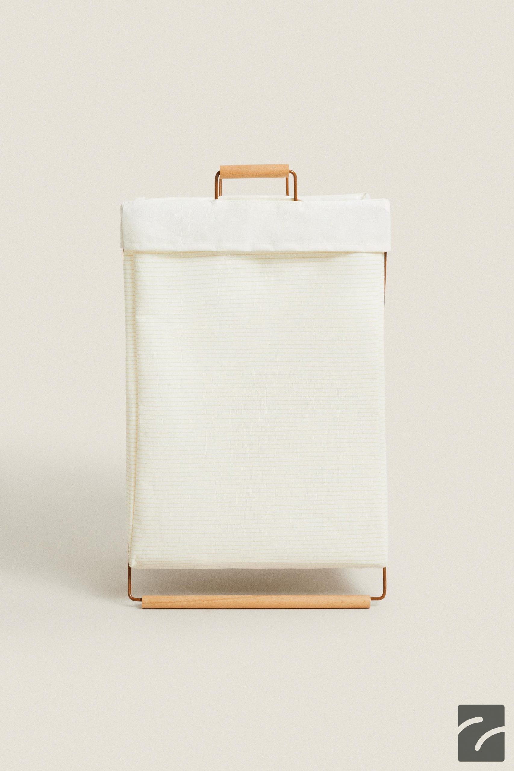 - Metal iskeletli ve ahşap saplı katlanabilir çamaşır sepeti. Yıkanabilir pamuklu astarlı.