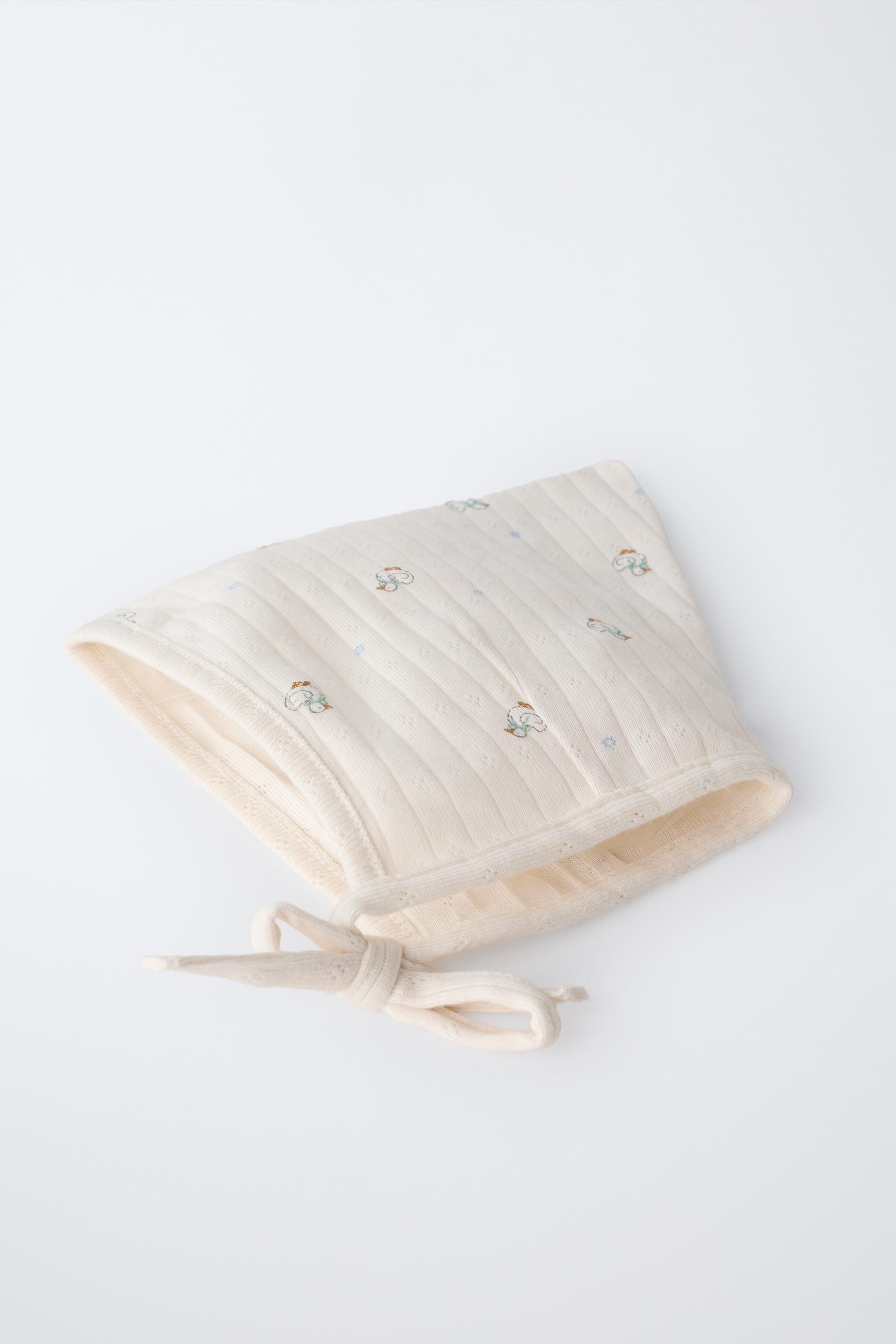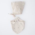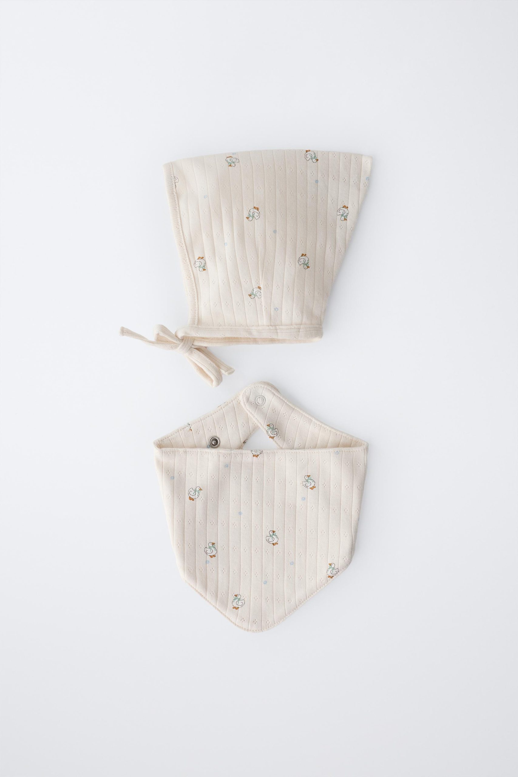 İki parçalı set. Önden ayarlanabilir bağcıklı başlık. Ense kısmından çıtçıtlarla ayarlanabilen bandana. Kaz baskılı.