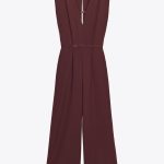 Tokalı, V yaka tulum. Kol ağzı pensli, düşük omuzlu. Tokalı, ince, aynı renk kemerli. Ön cepli. Geniş paçalı. Arkası fermuarlı, yırtmaçlı ve gizli düğmeli.