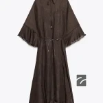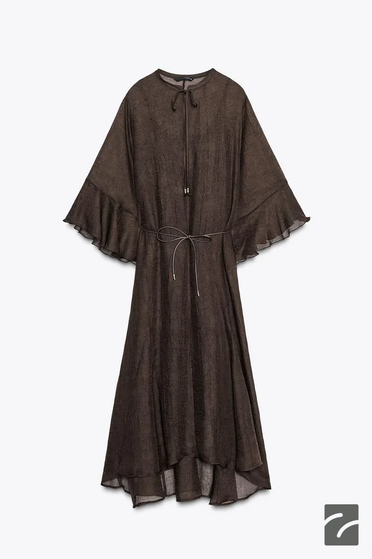 Bağcıklı bisiklet yaka, kaftan tarzı elbise. V yakalı ve dirsek altında biten volanlı kollu. İç astarlı ve kemerli.