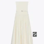 دست‌کش، پیراهن میدی با شانه‌های باز. کمربند قابل تنظیم با قفل فلزی. لبه دامن از پارچه‌ای با حجم و رنگ متضاد طراحی شده است.