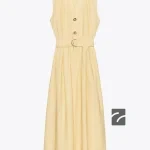 - Bisiklet yaka, kolsuz elbise. Beli pensli ve kemerli. Dikişe gizlenmiş yan cepli. Etek ucu kloş. Önü altın rengi düğmeli.