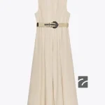 - Bisiklet yaka, kolsuz elbise. Penslerle şekillendirilmiş beli ve kemeri vardır. Dikişlere gizlenmiş yan cepleri bulunur. Etek ucu kloş kesimlidir. Arkası dikişe gizlenmiş fermuar kapamalıdır.