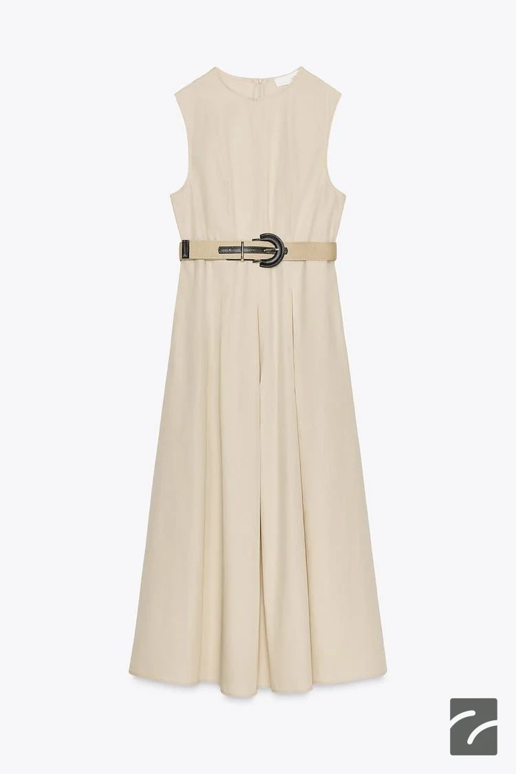 پیراهن بدون آستین با یقه بیسیکلت. دارای کمربند و کمر فرمدار با پنس. دارای جیبهای جانبی که در دوختها پنهان شدهاند. دامن پیراهن به صورت کلوش برش خورده است. در قسمت پشت، زیپ بستهشوندهای به صورت مخفی وجود دارد.