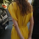 پیراهن کوتاهکمی با یقه گشاد و آستینهای کوتاه. دارای جزئیات کمربند نازک و الاستیک با چین و زنجیر. در قسمت پشت، زیپ مخفی و بسته شدن با دکمه دارد.
