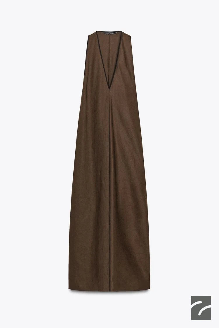 - Keten karışımlı iplikten üretilmiş midi elbise. V yakalı ve kolsuz. Kontrast renkli biyeler. Düz etek ucu.