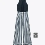 تولم از پارچه کتان. یقه هالتر و کمربند نازک همرنگ. جزئیات دوخت در ناحیه کمر. جیبهای جلو. پاچههای گشاد. بسته شدن با زیپ و دکمههای مخفی در پشت.