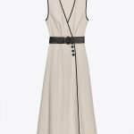 لباسی از پارچه کتان. دارای یقه V و بدون آستین. با جزئیات کمربند و نوار در رنگهای متضاد. بسته شدن دکمهای به صورت مایل از جلو.