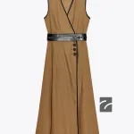 لباسی از پارچه کتان. دارای یقه V و بدون آستین. با نوارهای رنگ متضاد و کمربند عریض. بسته شدن جلو به صورت کراواتی و با دکمه.