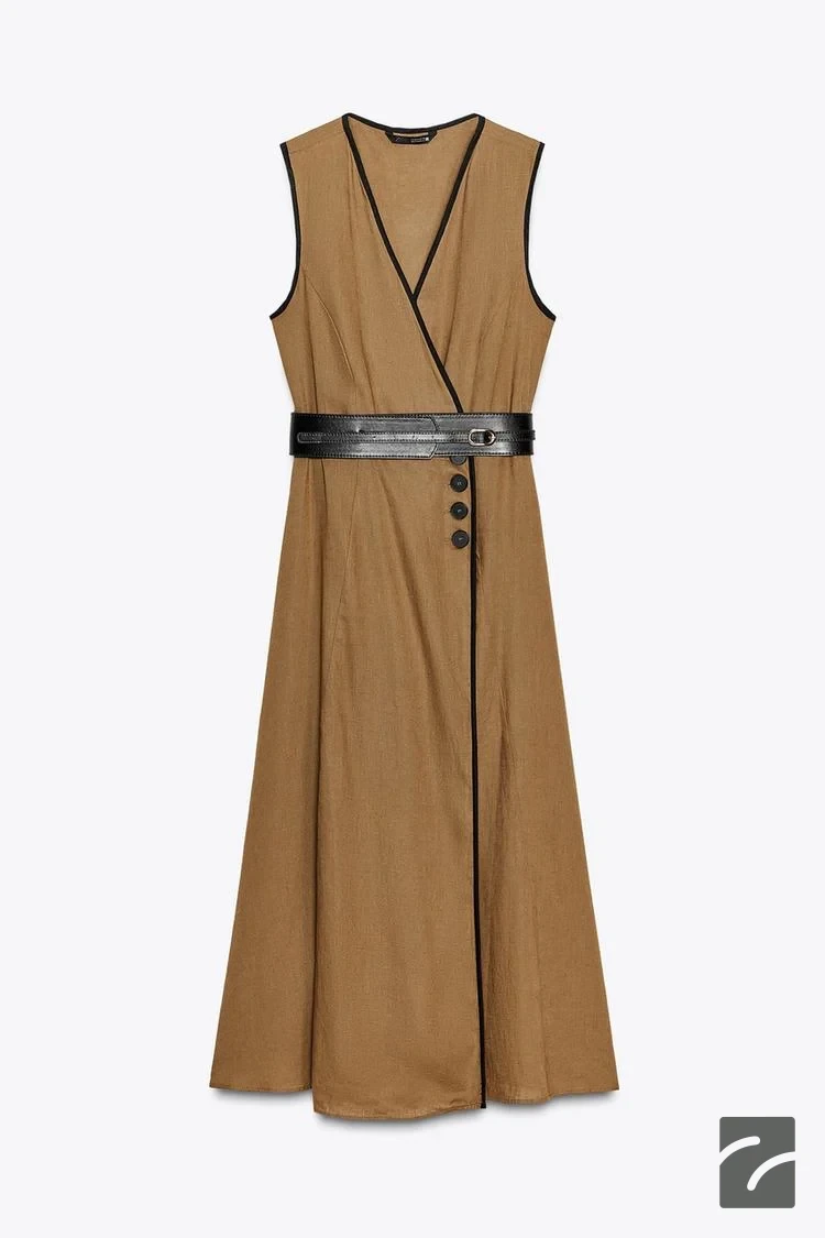 Keten kumaştan üretilmiş elbise. V yakalı ve kolsuz. Kontrast renklerde biyeli ve geniş kemerli. Kruvaze ön kapamalı ve düğmeli.
