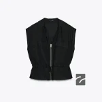 Keten kumaştan üretilmiş üst. V yaka, gömlek yakalı ve kolsuz. Kapaklı yama ön cepli. Büzgülü ayarlanabilir belli. Önden fermuarlı kapamalı.