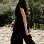 - Keten kumaştan tulum. V yaka ve kısa kollu. Elastik belli ve tokalı, aynı renk kemerli. Ön cepli. Geniş paçalı. Arkası açık ve düğmeli.