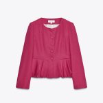 - Keten kumaştan üretilmiş blazer ceket. Yuvarlak yakalı ve vatkalı uzun kollu. Büzgülü etek ucu. Önü aynı tonda kaplı düğmelerle kapatılır.