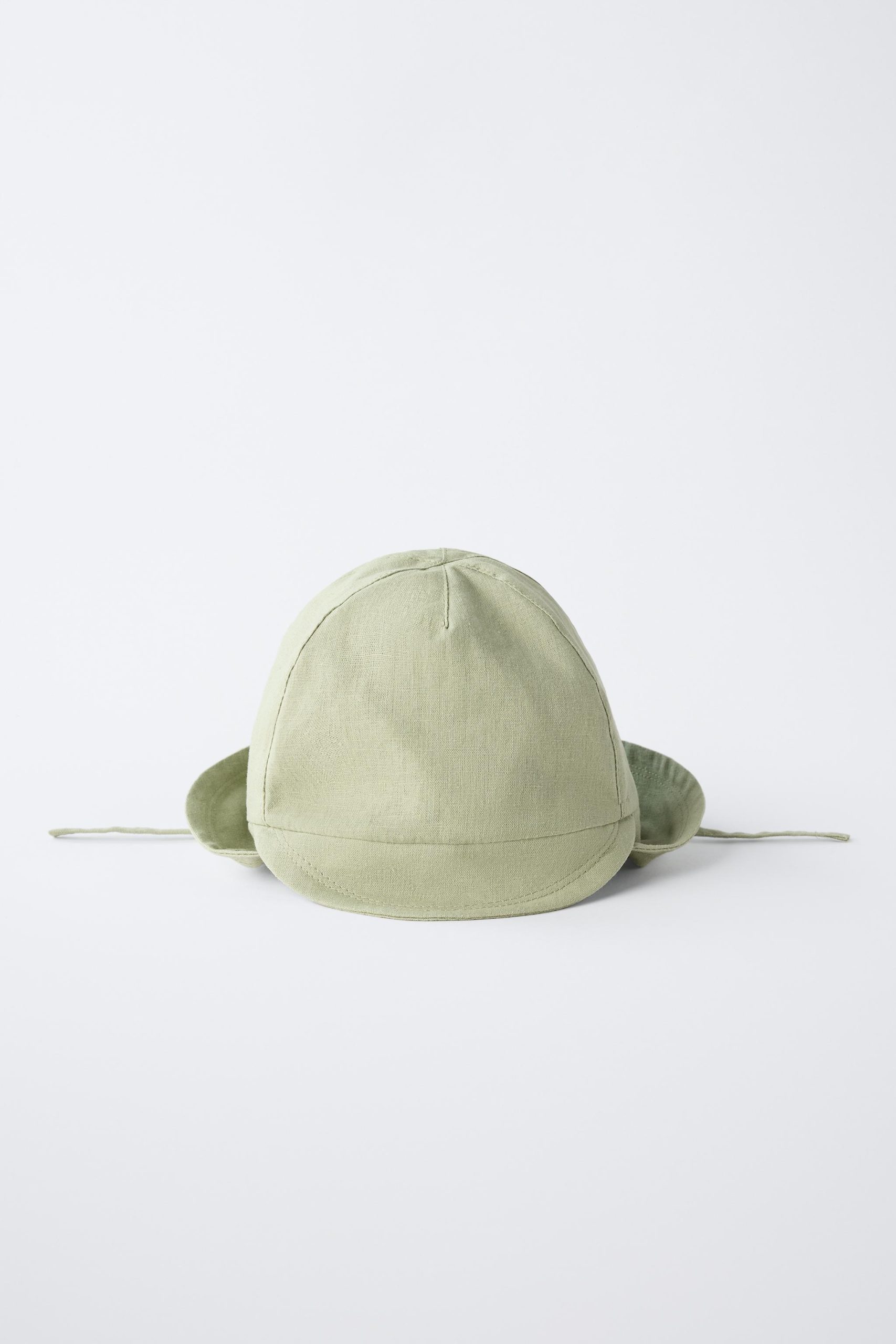 - Vizörlü ve ön tarafında bağcıklı şapka. %50 keten ve %50 pamuklu kumaş.