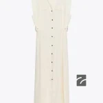 لباسی از پارچه کتان. دارای یقه V، یقه گرد و بدون آستین. دارای جزئیات دکمهای در جلو و نوارهای تزئینی در کنارههای کمر. بسته شدن از جلو با دکمه.