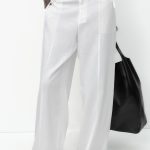شلوار تولید شده از پارچه کتان. دارای کمر بلند، کمربند باریک و قفلهای جانبی. دارای جیب جلو و جیب پشتی وصلهای. با پاچههای گشاد. بسته شدن از جلو با زیپ، دکمه داخلی و قلاب.