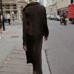 دامن میدی ساخته شده از پارچه ساتن با اثر چیندار. دارای کمر بلند و کشی.