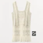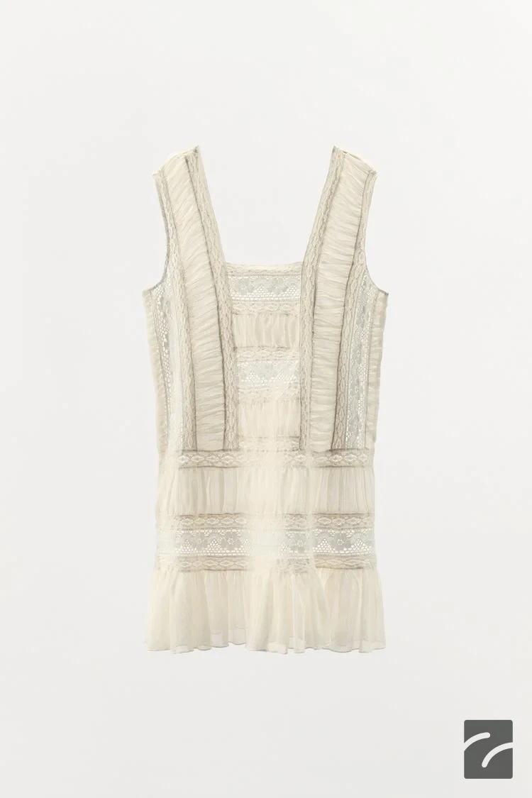این مینی لباس از الیاف پنبهای تهیه شده است. دارای یقه ساده و بندهای ضخیم است. جزئیات چیندار و بافتی در همان رنگ به کار رفته است. تزیینات دانتل در رنگهای متضاد به کار رفته است. لبه دامن با پارچهای مشابه چیندار شده است. در سمت کناری، زیپ با دوخت مخفی قرار دارد.