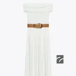 پیراهن یقهدار، با طراحی منحنی و شانههای باز. دارای جزئیات کمربند عریض و پارچه ساتن ترکیبی. بسته شدن با زیپ مخفی در دوخت کناری.