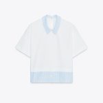 - Kontrast renkli, kombine yakalı bisiklet yaka tişört. Kısa kollu. Kombine kumaşlı etek ucu. Arkası açık ve düğme kapamalı.