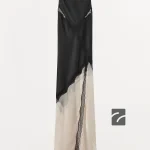 - Akıcı yakalı ve ince askılı, uzun, kombine elbise. Dantel aplikeli detaylı. Kontrast ön yırtmaçlı etek ucu. Dikiş içinde gizli fermuarlı yan kapama.