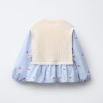 - Lastikli uzun kollu, bisiklet yaka gömlek. Çizgi baskılı ve nakış detaylı kurdeleli. Üzerine giyilen, bisiklet yaka ve kolsuz örgü yelek. Yanlarda kurdele aplikeler.