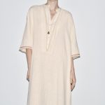 Keten iplikten üretilmiş kaftan. Kontrast nakış aplikeli, dirsek altında yuvarlak yakalı ve kollu. Ön kısımda pile detayı ve uyumlu renkte güpürlü bitişler. Önden düğmeli kapama.