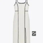 پیراهن یقهدار با بندهای ضخیم. دارای جزئیات نوار رنگ متضاد و دکمهدار در جلو. جلو دارای شیار و در دوخت کناری دارای زیپ مخفی است.