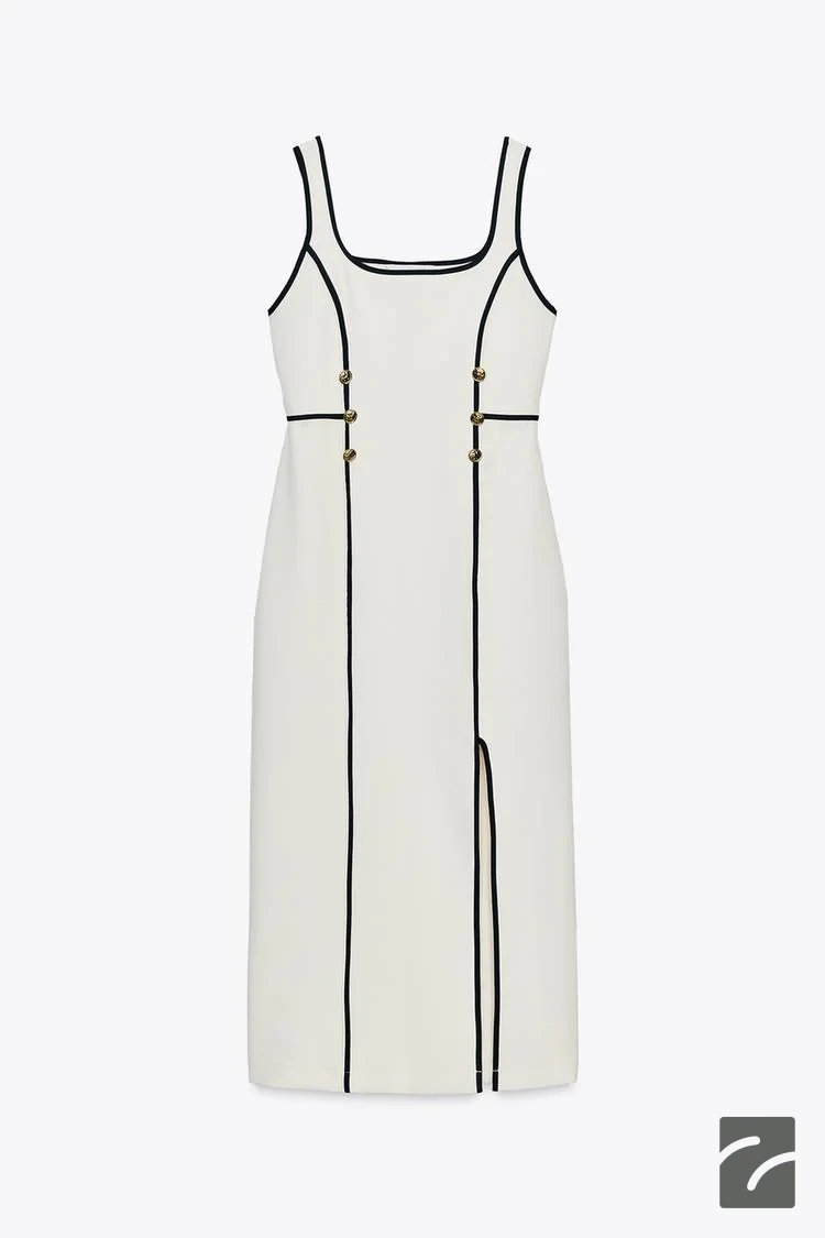 - Kare yakalı ve kalın askılı elbise. Kontrast renklerde şerit detaylı ve önü düğmeli. Önü yırtmaçlı. Yan dikişte gizli fermuarlı.