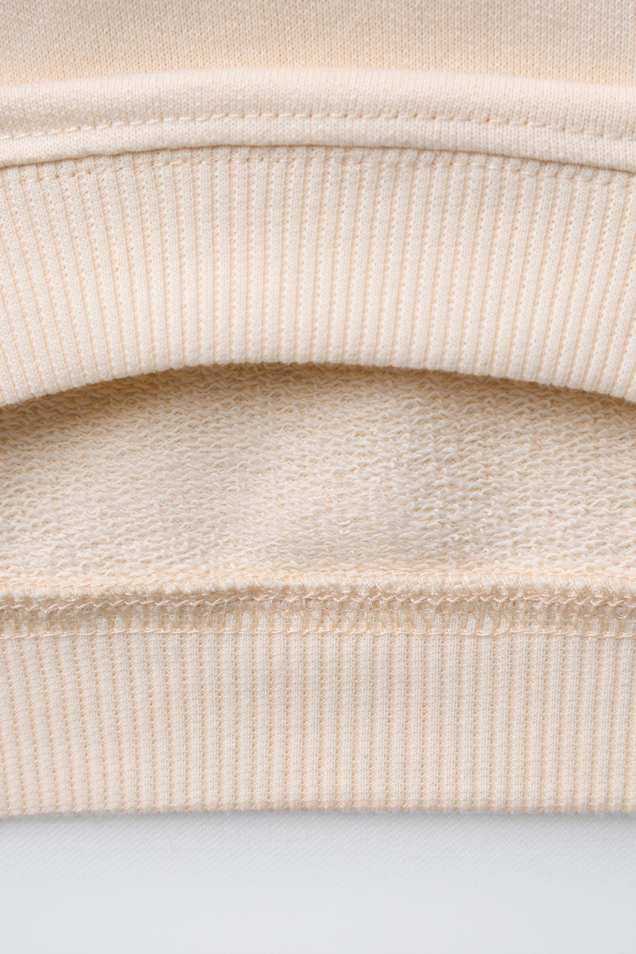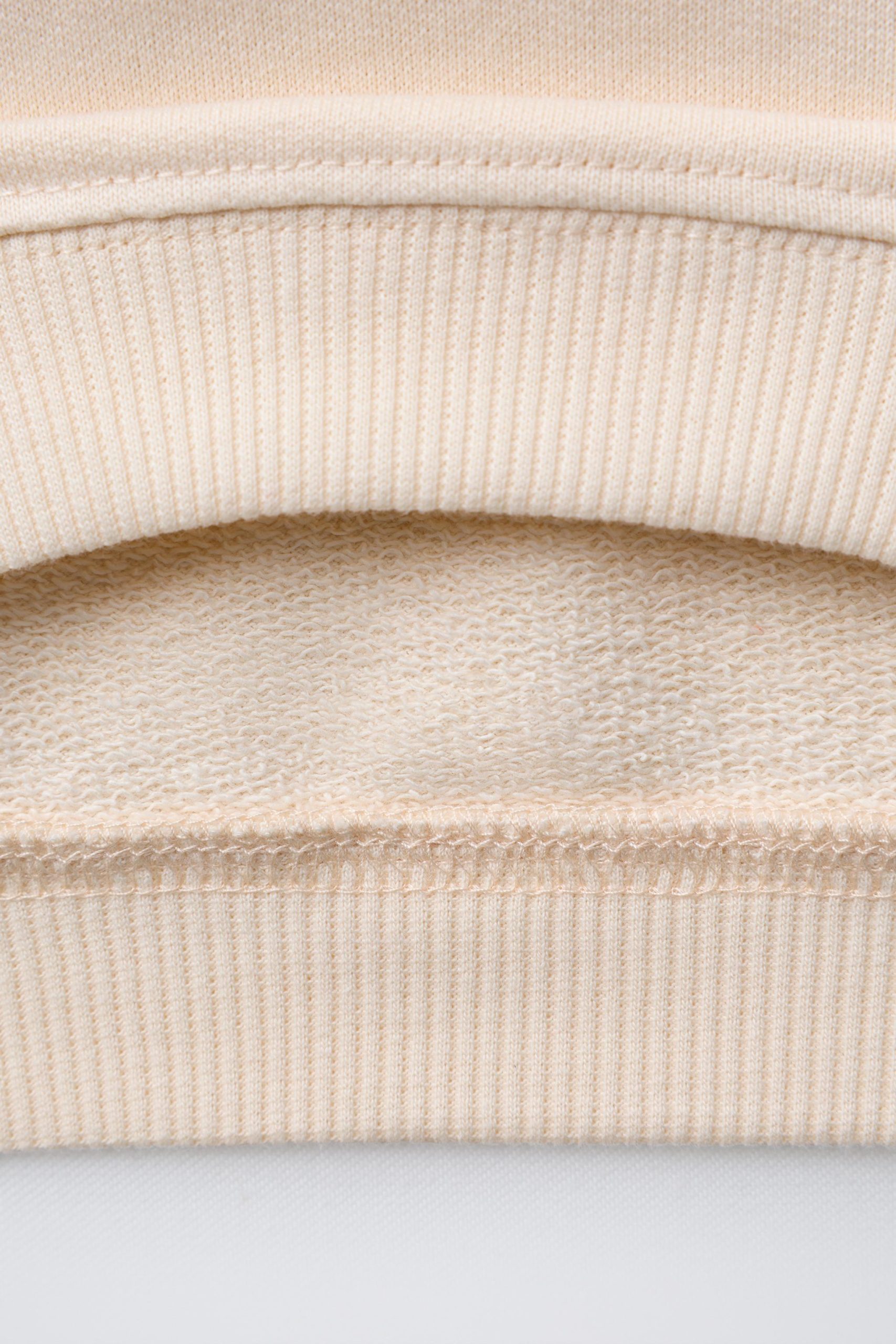 سویشرت یقه ببه، با آستینهای بلند و طرح گلدار. دارای لبههای کشباف. قسمت پشت آن دکمهدار و دارای جزئیات برش به شکل قطره است. روی آستین آن نوشتهای با دوخت گلدوزی شده است. از پارچه ۱۰۰% پنبهای تهیه شده است.