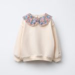 - Bebe yaka, uzun kollu, çiçek desenli sweatshirt. Ribanalı. Arkası düğmeli ve damla şeklinde açıklık detaylı. Kolunda nakış işlemeli yazı detayı. %100 pamuklu kumaş.