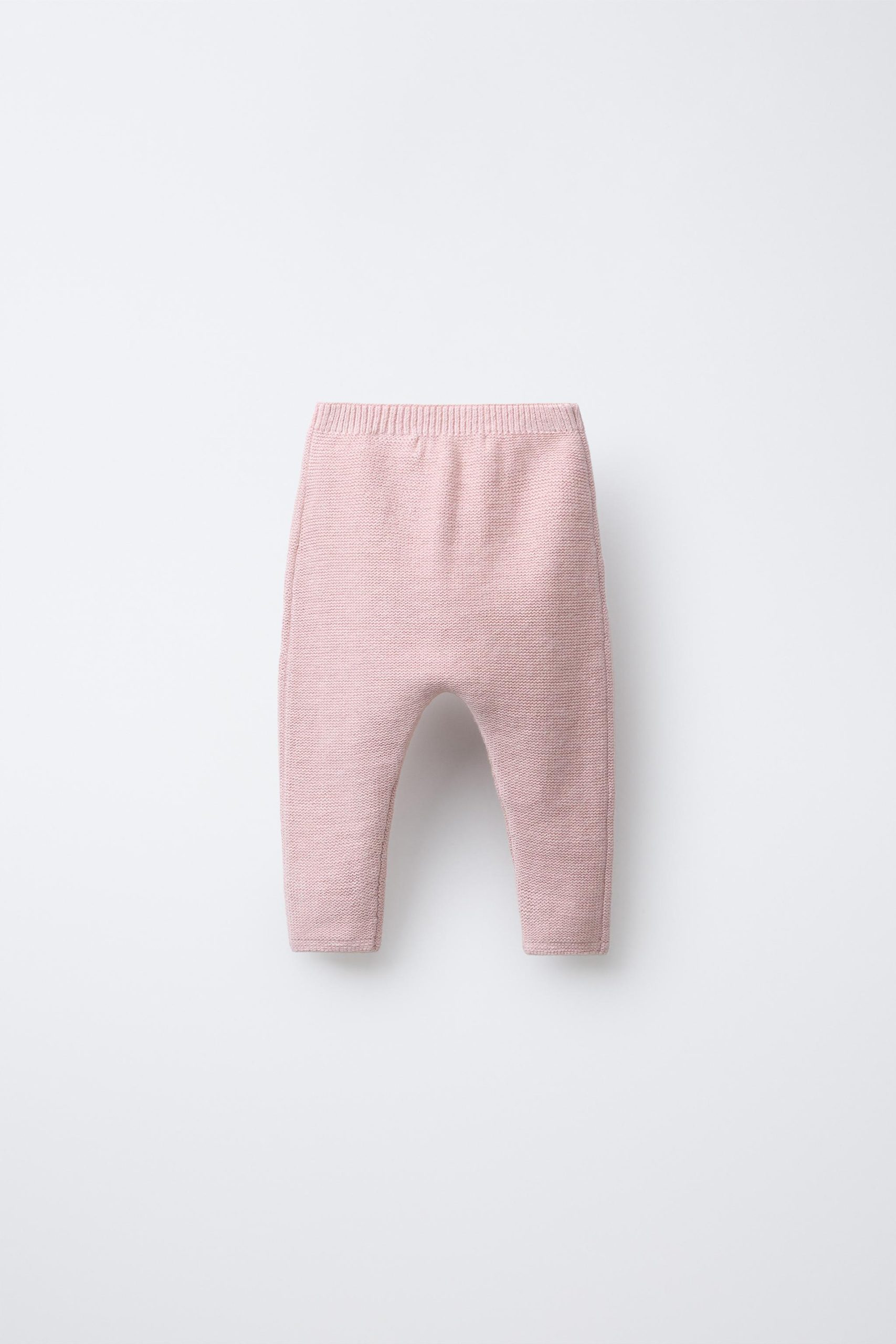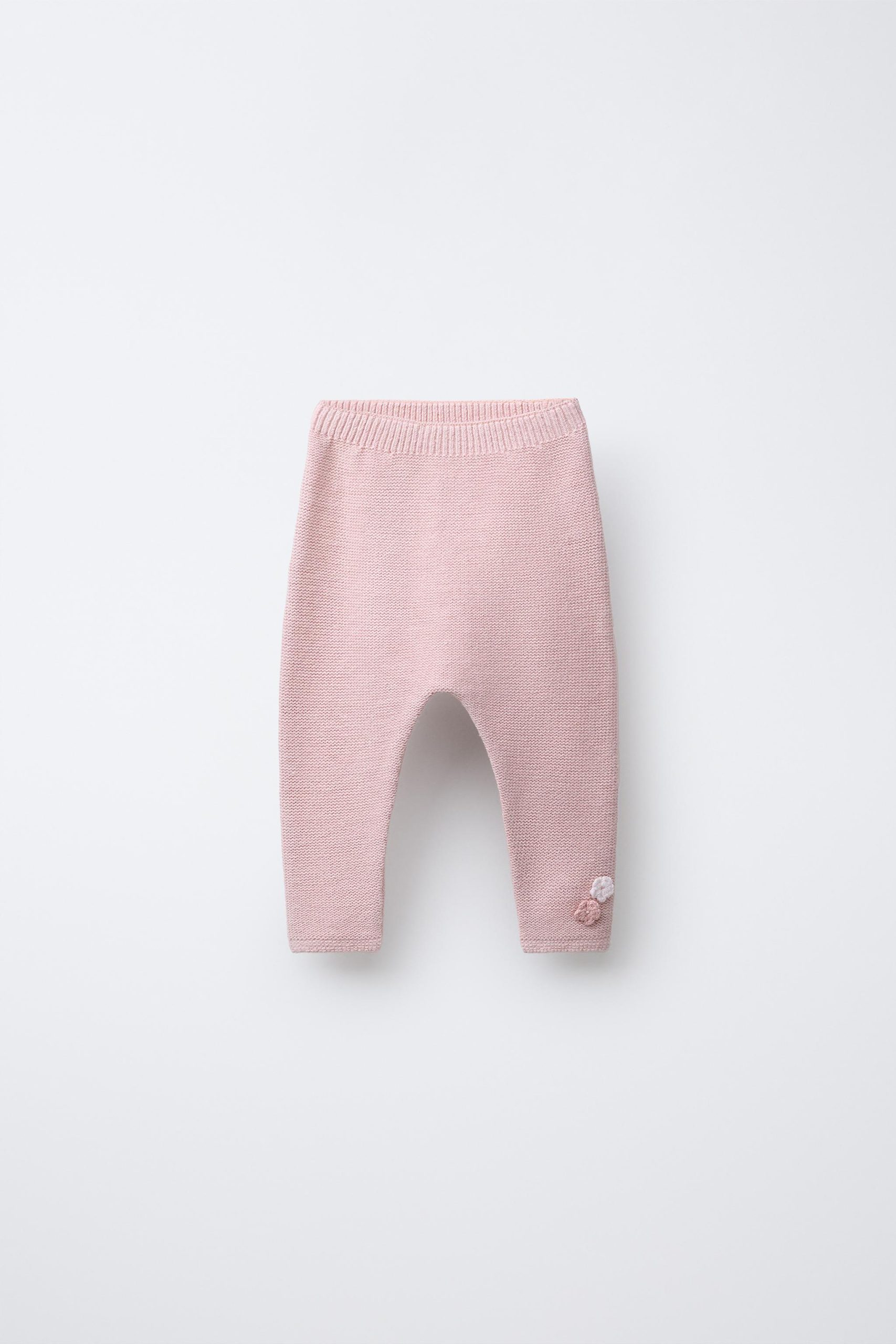 شلوار بافتنی با کمر الاستیک و تزئینات گل با قلاب بافی در انتهای شلوار.