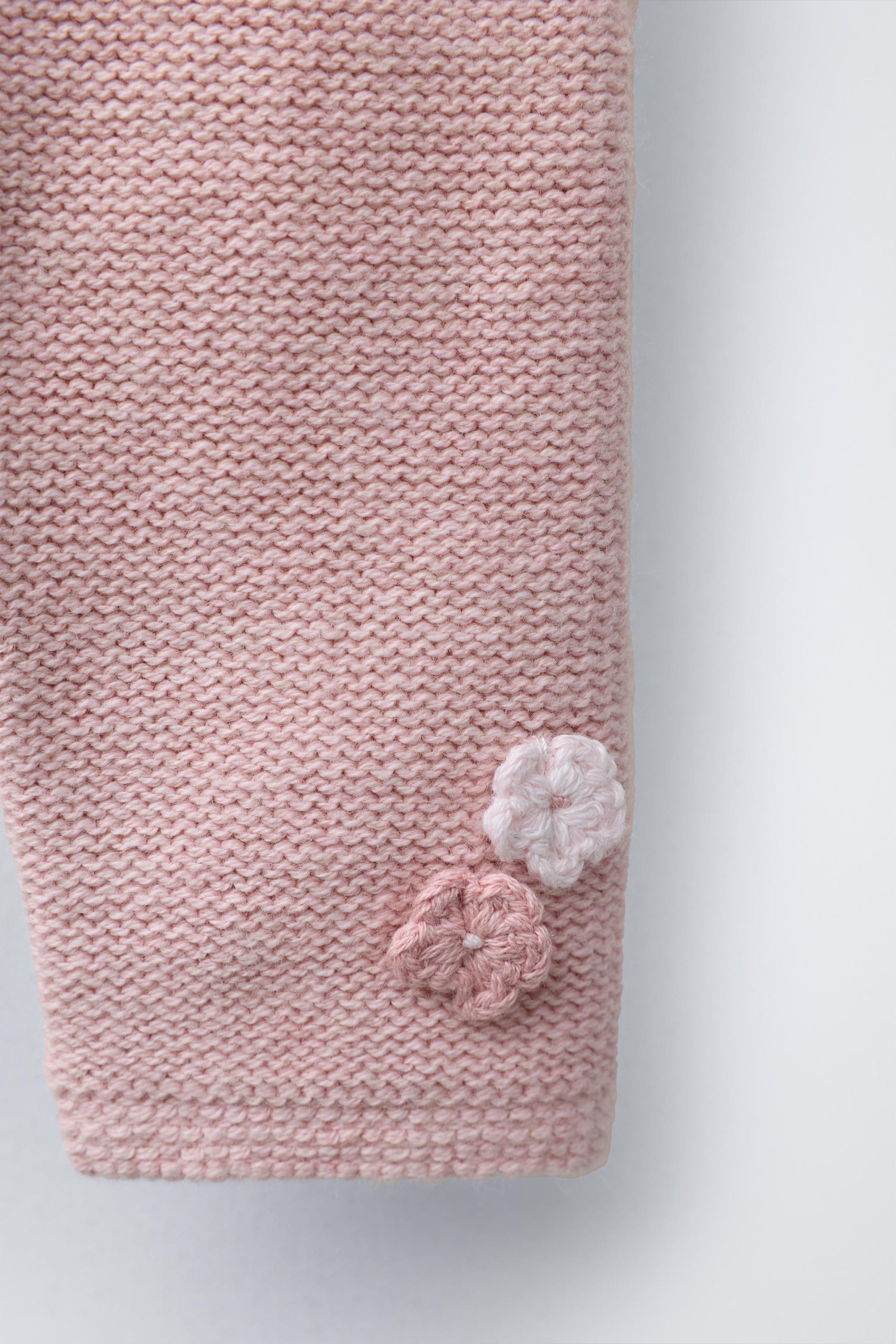 Elastik belli ve etek ucunda kroşe örgü çiçek aplikeli, triko pantolon.