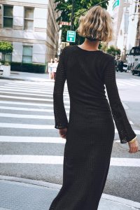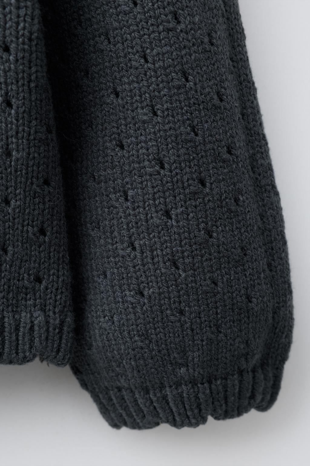 کالا: بلوز بافتنی آستین بلند از پارچه کروشه، یقه بچگانه با جزئیات گل‌دار و دکمه‌دار در پشت، با طراحی دراپه.