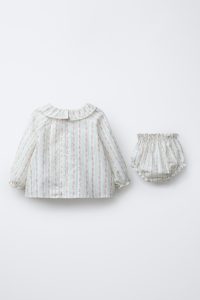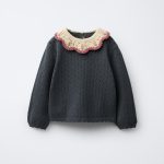 • Kroşe kumaş bebe yaka, işlemeli çiçek detaylı, uzun kollu, örgü kazak. Arkası düğmeli, damla şeklinde kapamalı.