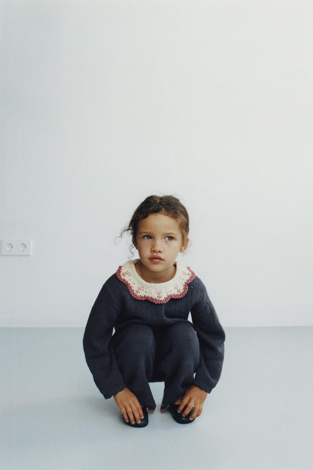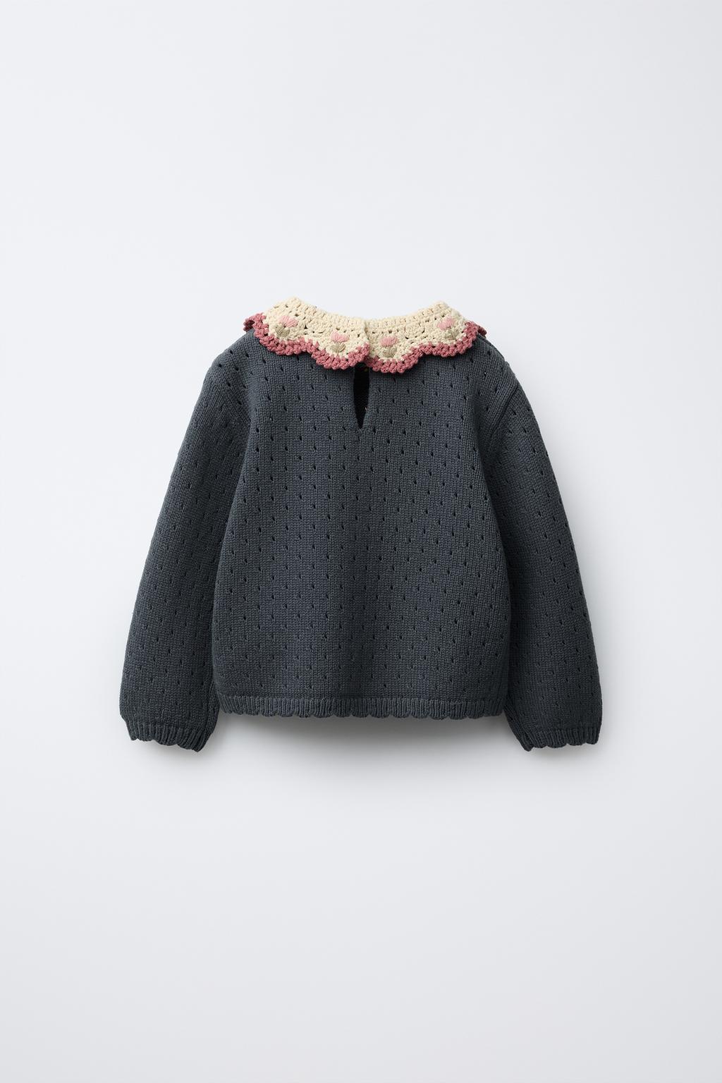 Kroşe kumaş bebe yaka, işlemeli çiçek detaylı, uzun kollu, örgü kazak. Arkası düğmeli, damla şeklinde kapamalı.
