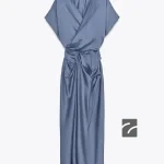 پیراهن میدی با یقه V و یقه چاکدار، دارای سطح ساتن. آستین کوتاه. دارای جزئیات جمعشدگی در ناحیه کمر. قسمت پشت دارای چاک و زیپ مخفی در دوخت.