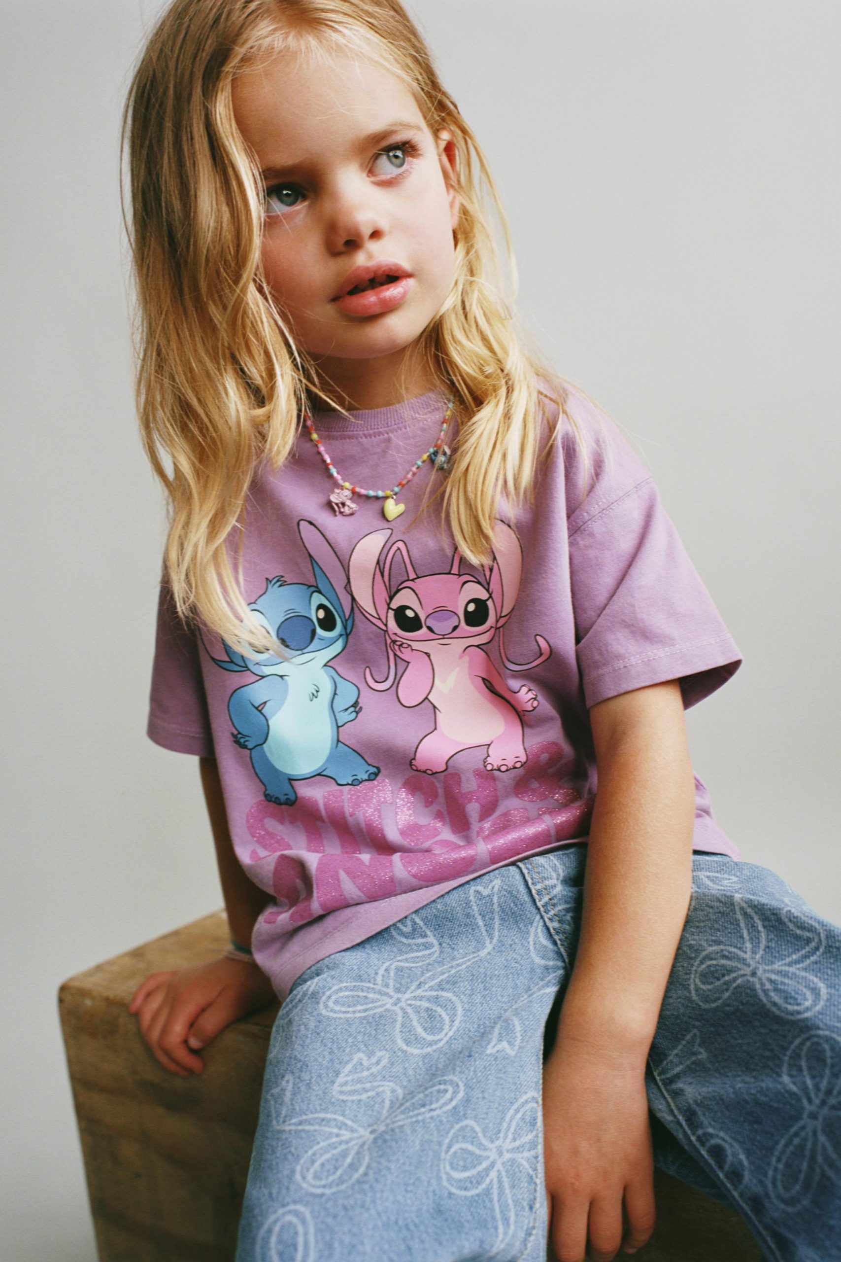 شلوار جین کلوته با کمر قابل تنظیم و دکمه‌های چسبی در جلو. دارای جیب‌های جلو و جیب‌های پشتی با درب است. طرح آن با نوار تزئینی چاپ شده است.