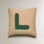 کوسن کودک با طرح راهراه و حرف “L” در وسط، از جنس پنبه. شامل پرکننده است.