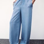 - Bağcıklı, ayarlanabilir, lastikli yüksek bel pantolon. Ön cepli ve arka yama cepli. Geniş paça.