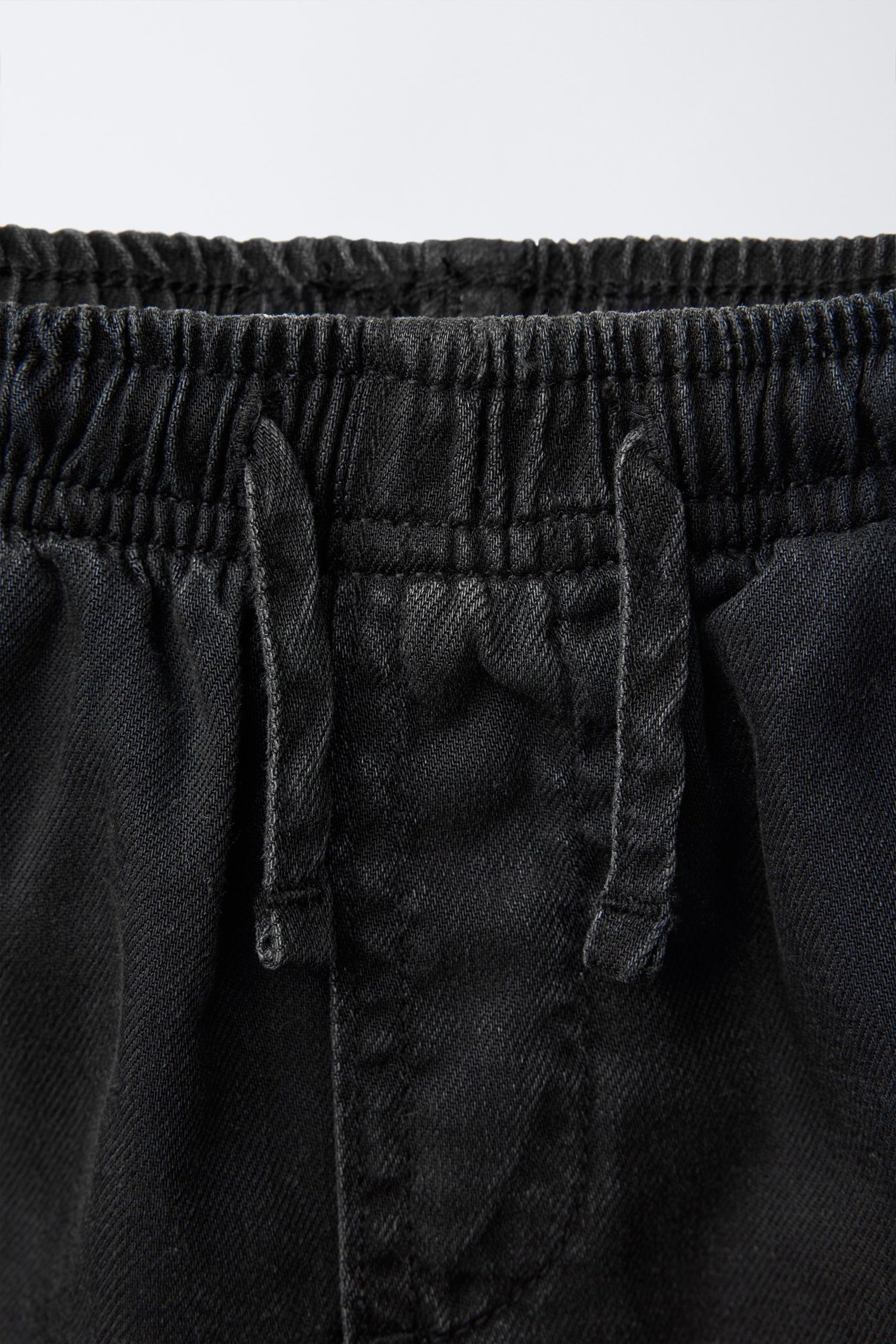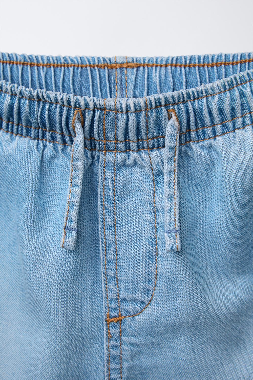 شلوارک جین برمودا با کمر الاستیک و بندهای قابل تنظیم در جلو. این شلوارک دارای جیبهای جلو و جیب یقهای در پشت است. در کنارهها با تزیینات و در قسمت جلو با برچسب مشخص شده است.