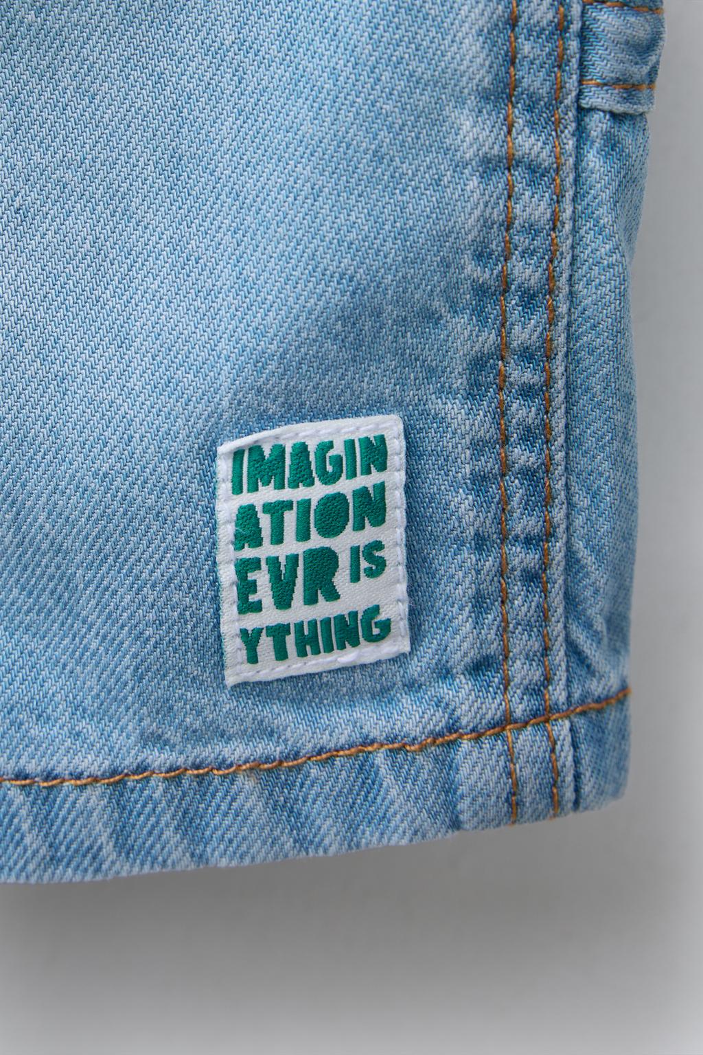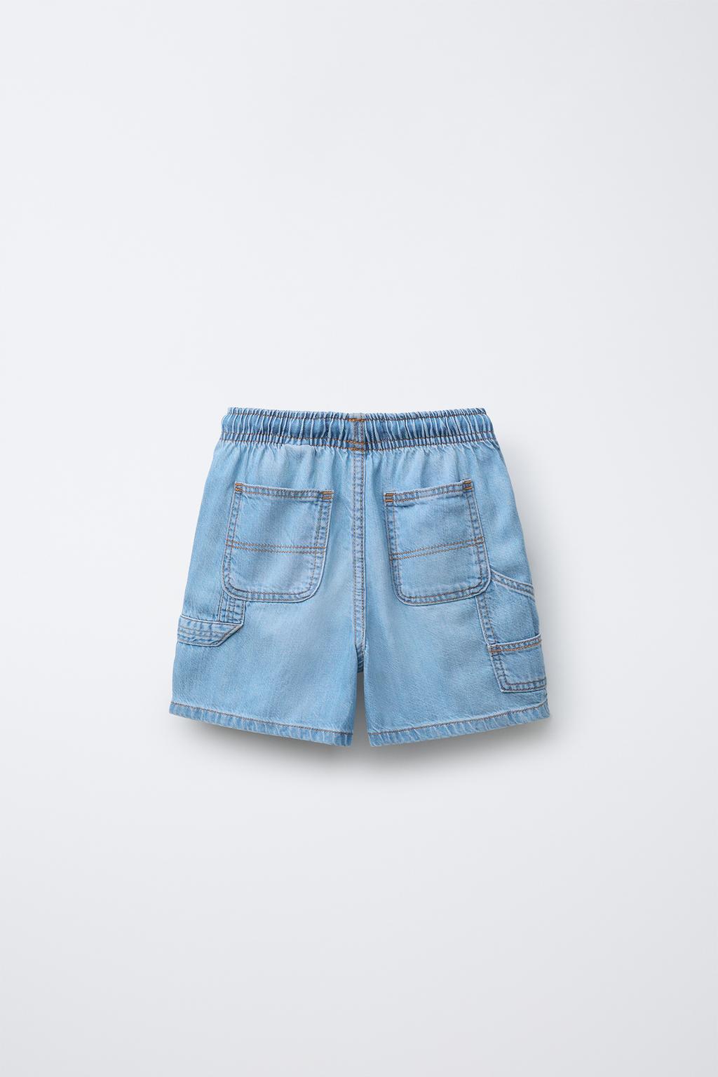 - Elastik belli ve ön tarafı ayarlanabilir bağcıklı denim bermuda. Ön cepli ve arkada yama cepli. Yanlarda aplikeli ve ön kısımda etiketli.
