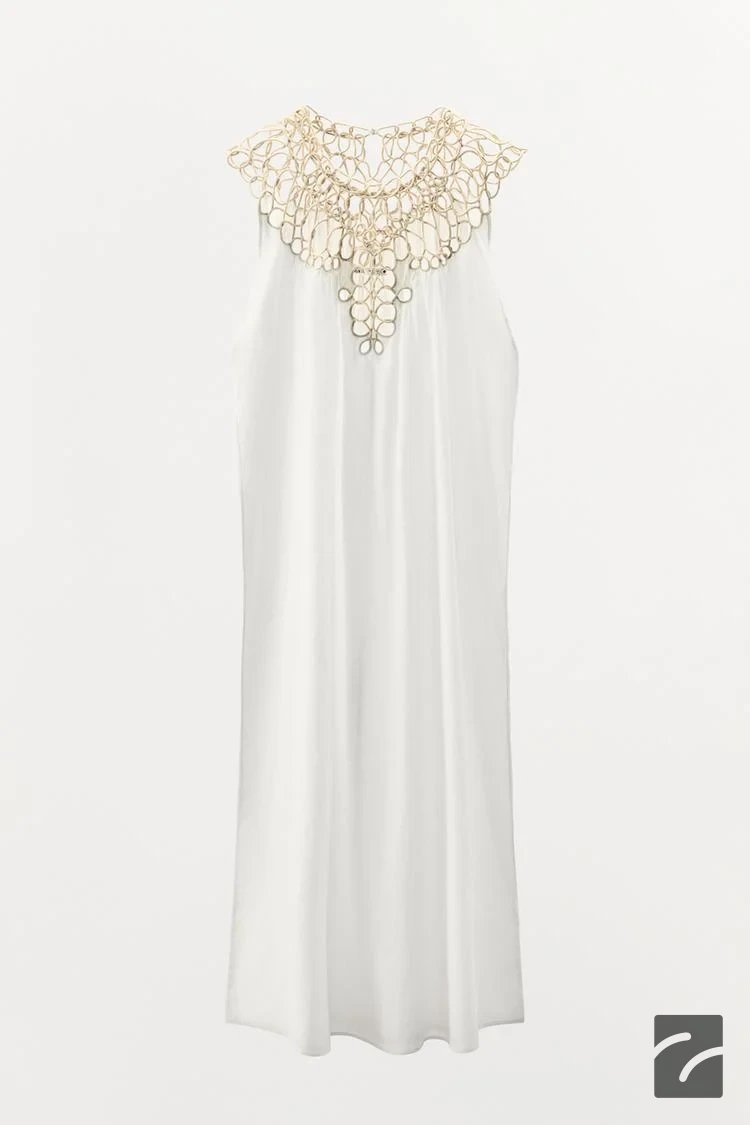 %100 pamuk iplikten üretilmiş midi elbise. Aynı tonda kombine edilmiş kordon aplikeli detay. Arkadan gizli düğme kapamalı.