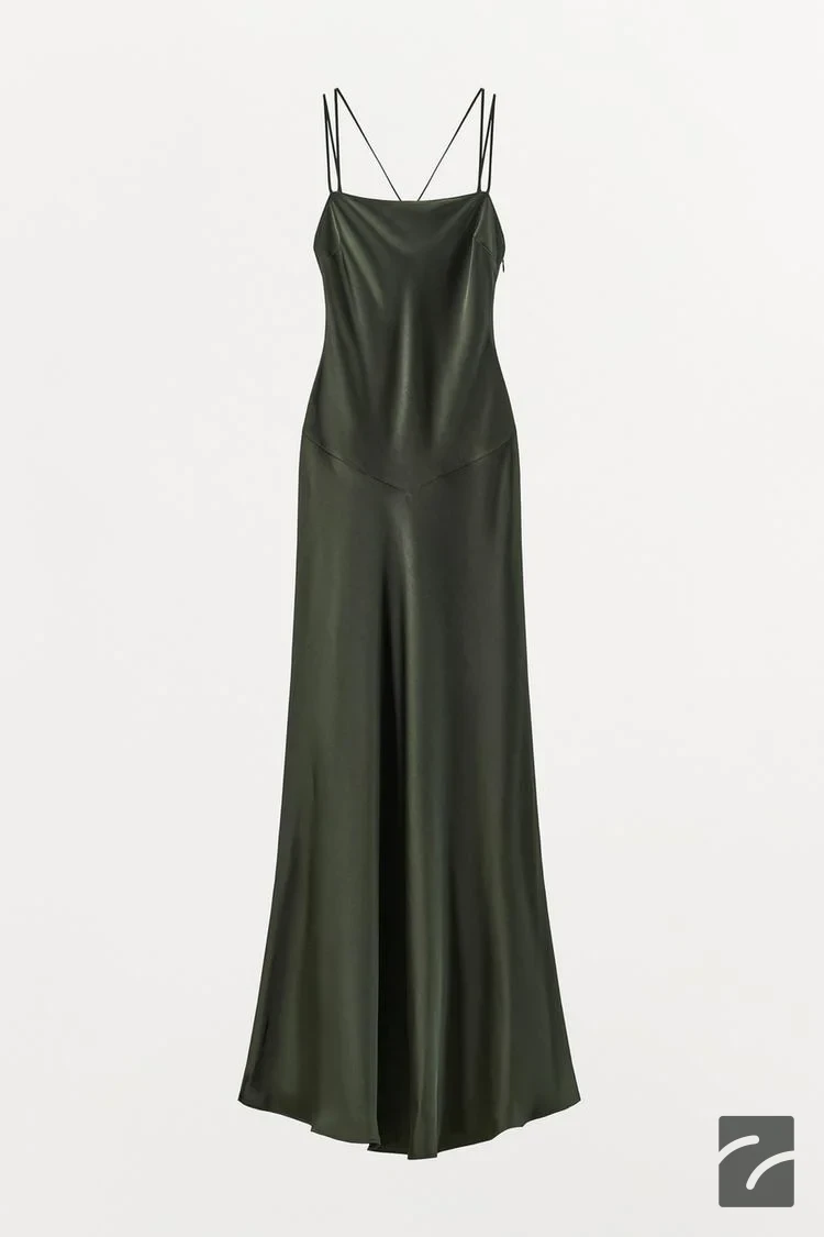 - Saten kumaştan üretilmiş, düz yakalı uzun elbise. Arkasında çapraz çift askı detayı. Yan dikişte gizli fermuar kapamalı.