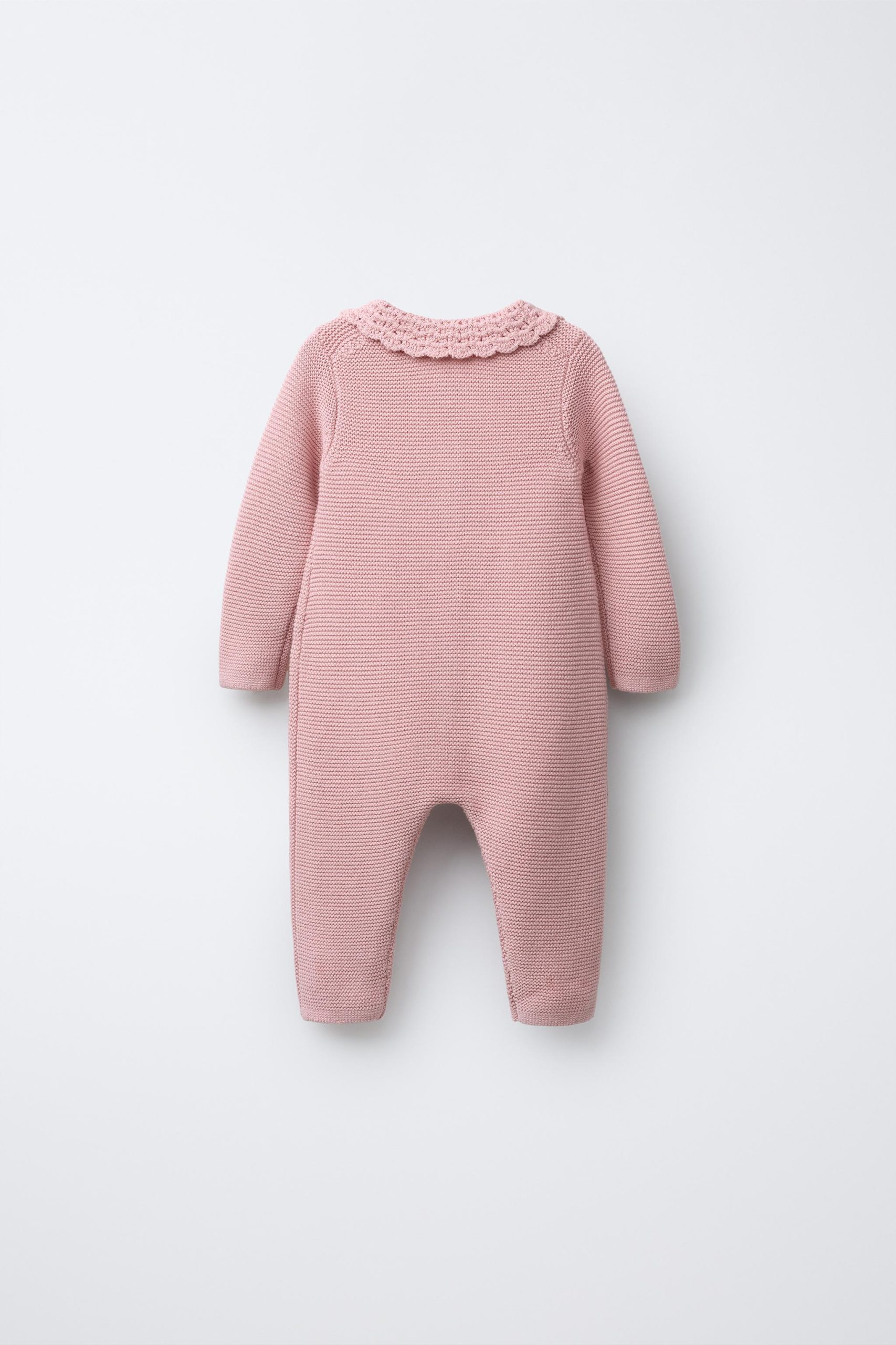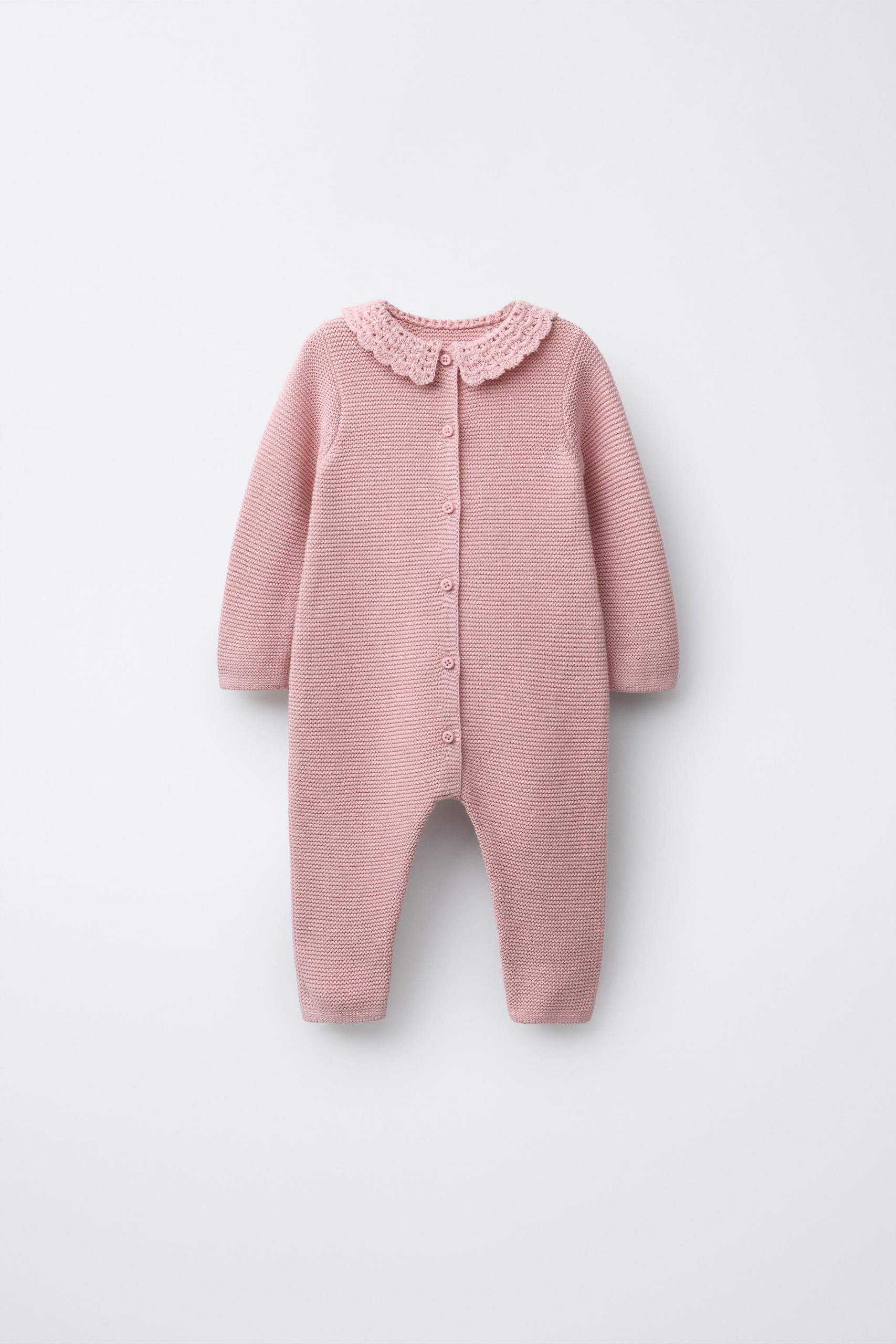 Kroşe bebe yakalı, uzun kollu, önden düğmeli, uzun örgü tulum.