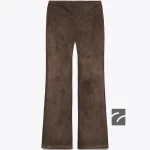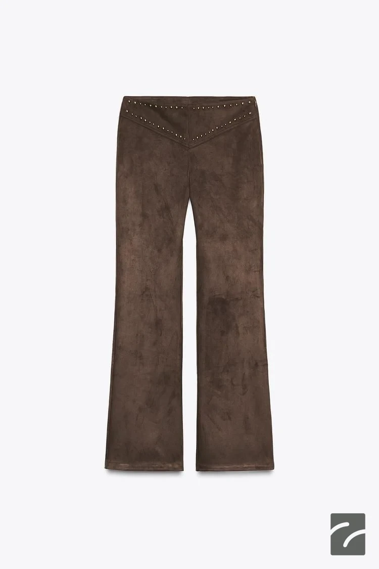 Suni süet kumaştan üretilmiş, yüksek bel pantolon. Metal detaylı aplikeli. Yan dikişte gizli fermuar kapamalı.